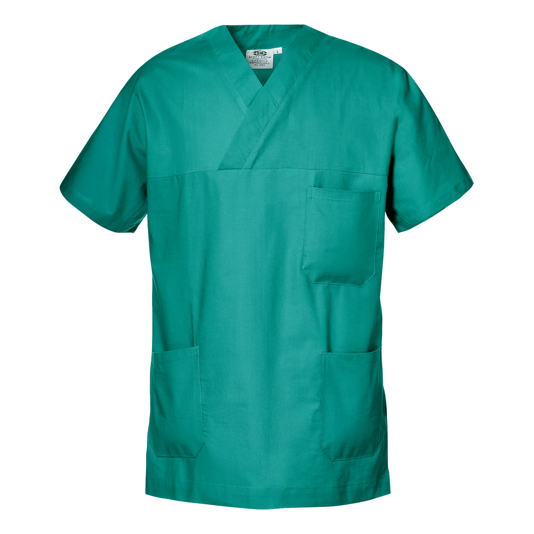 Made of 100% sanforized cotton cloth 16/24, 190 g/m2, V-neck, two side pockets and a chest pocket with rounded corners, side slits; loose fit.