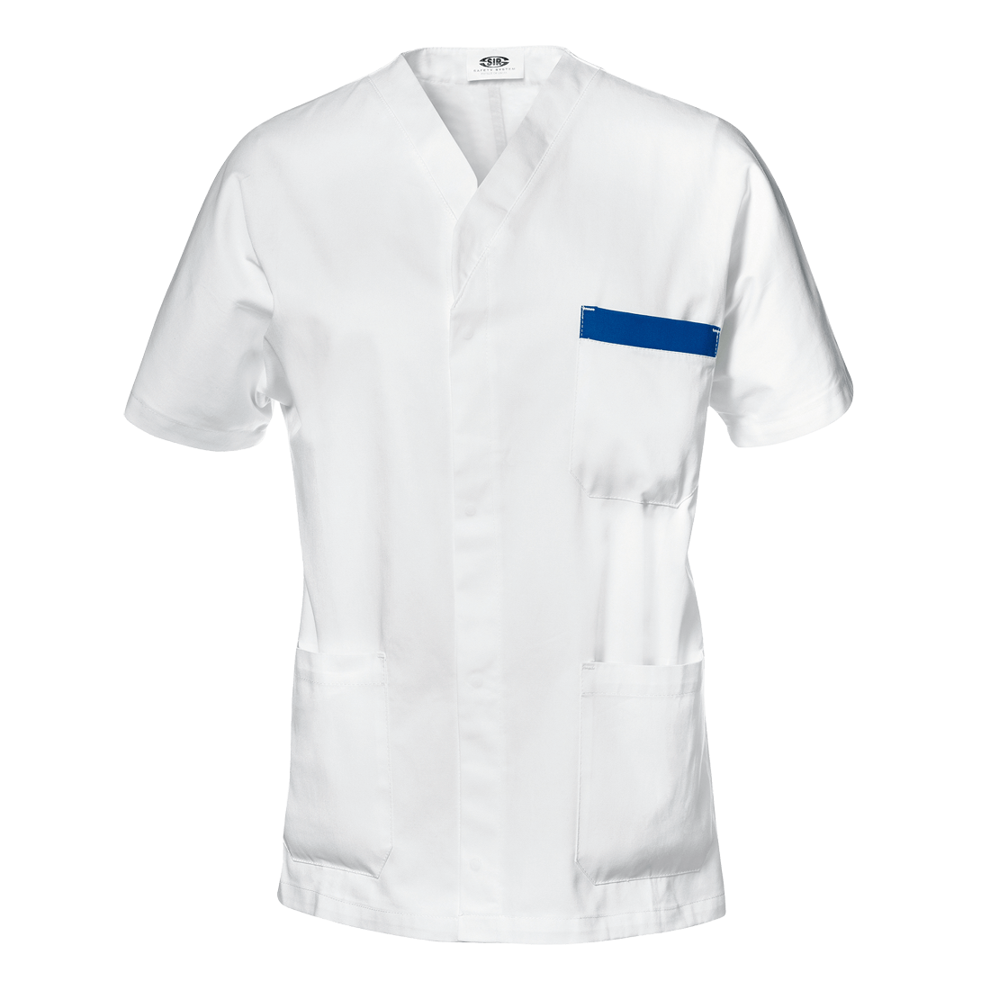 Nurse open tunic made of 100% gabardine cotton, double twisted sanfor, weight 210 g/m2 with concealed snap buttons placket, two front pockets and chest pocket with a coloured insert.