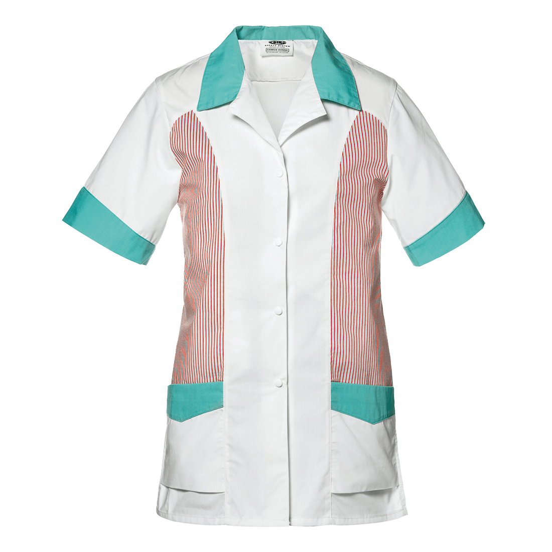 Short-sleeved coat made of Terital Cotton, 65% polyester and 35% sanforized cotton, 150 g/m2, short model with shirt collar, snap button closure and side slits; details on collar, sleeves’ edge and on pockets in contrasting colours.