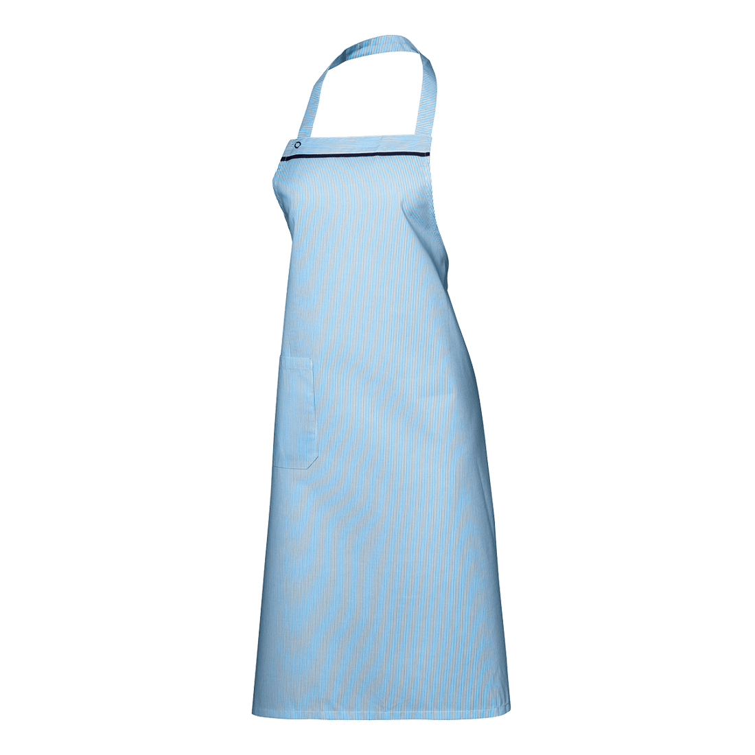 Apron made of terital/cotton, 65% polyester and 35% cotton, 150 g/m2, fabric string closure, side pocket, adjustable neck width with snap buttons.