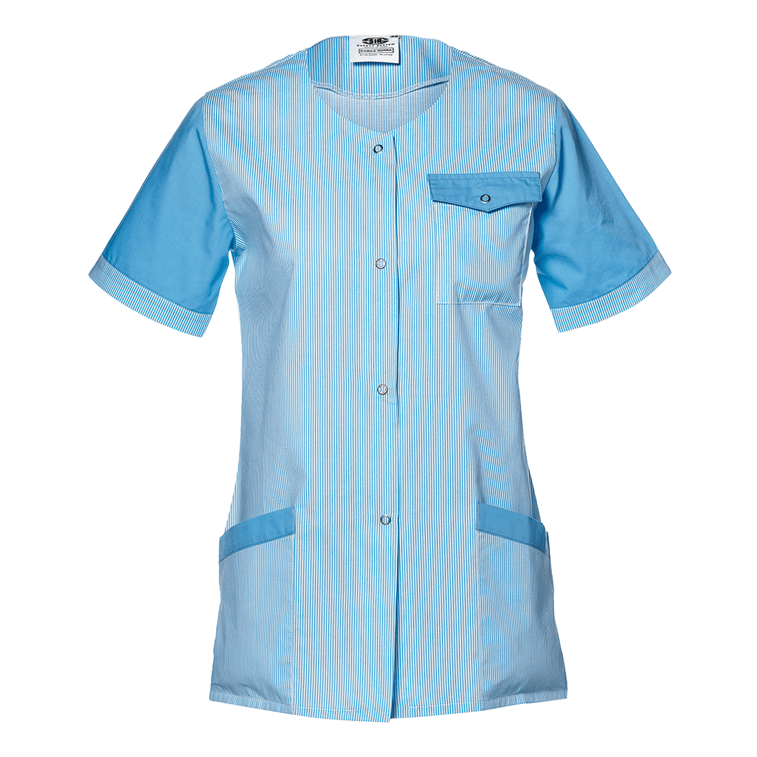 Coat made of Terital Cotton, 65% polyester and 35% sanforized cotton, 150 g/m2, four snap button closure, side slits, short sleeves, two pockets, chest pocket with flap and snap button, sleeves’ and pockets’ profile in contrasting colours; shaped model, hip length.