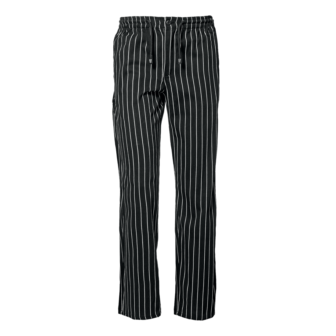 Functional trousers made of 65% polyester and 35% cotton, 190 g/m2, with white/black stripes and elastic drawstring on waist; fly with button and zip.