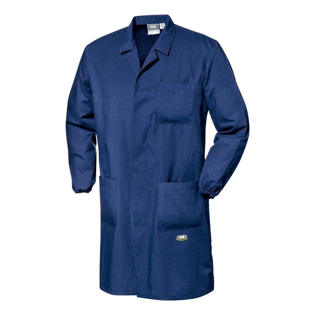 Coat for men made of 65% polyester and 35% sanforized cotton, 150 g/m2; concealed four button closure, two side pockets and one chest pocket, back slit and elastic cuffs.