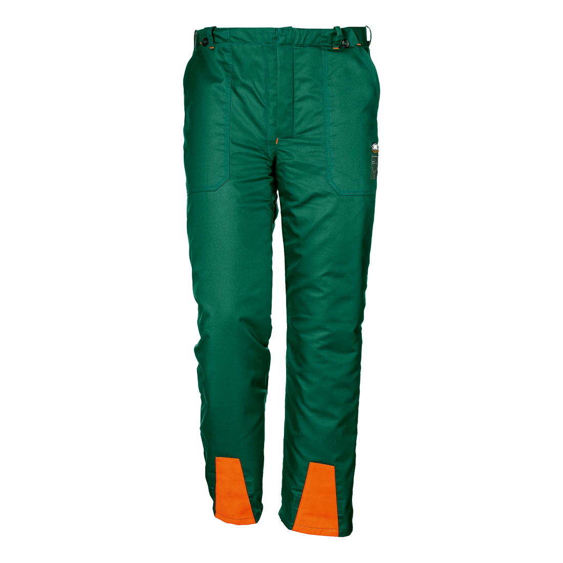 Trousers in 65% polyester and 35% cotton, 240 g/m2, with padding around the legs in PET, 155 g/m2, for cut protection. It features a front zipper and inner button, front welt pockets and back pocket with flap and Velcro, right ruler pocket and buttons between the loops for the shoulder straps.