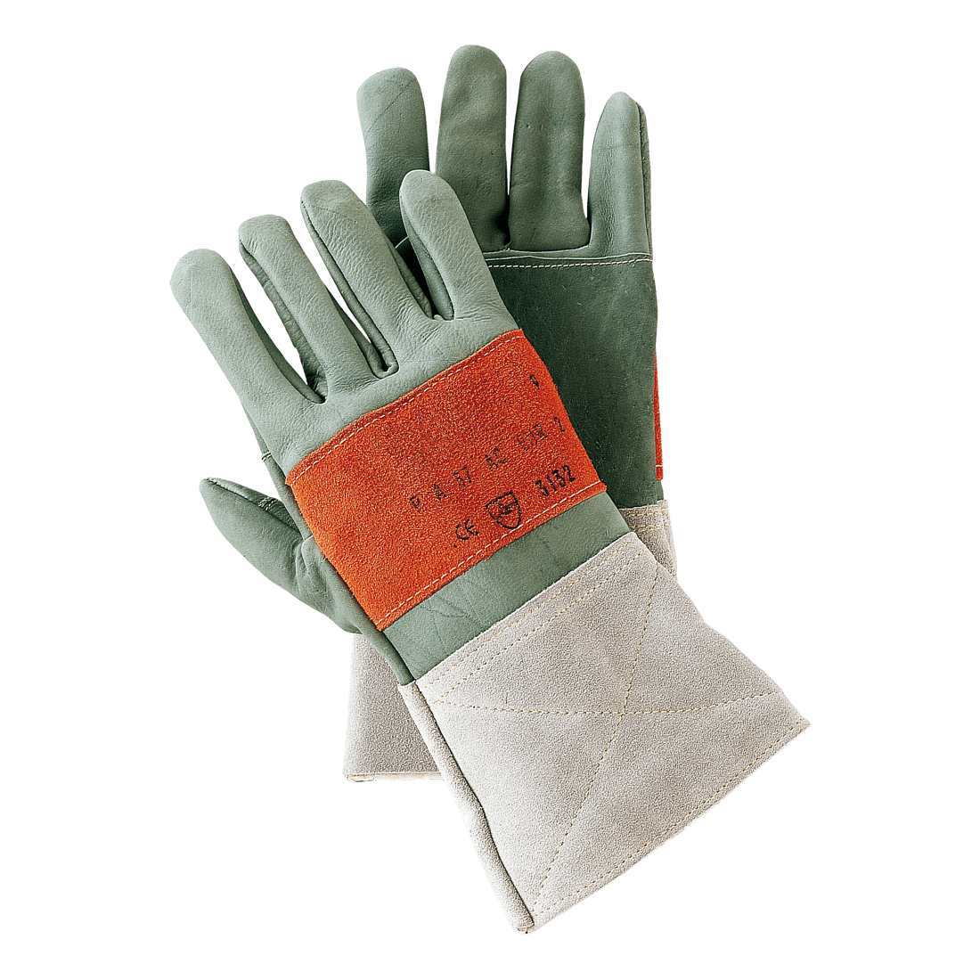 Glove in full grain leather with cuff in split leather and chainsaw protection on the back, aramidic thread stitching.