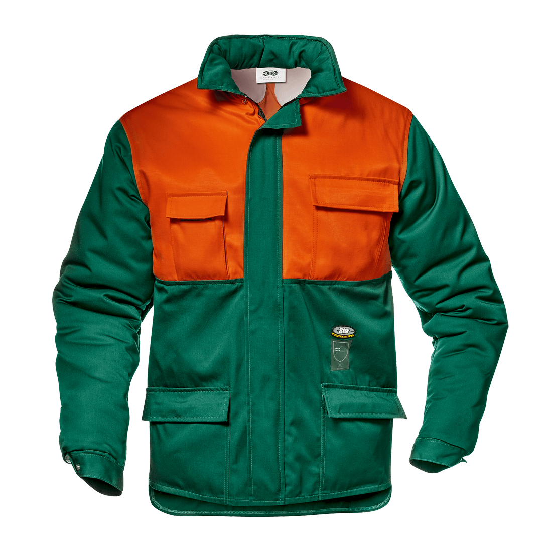 Jacket in 65% polyester and 35% cotton, 240 g/m2, with padding on the arms and on the shoulders in PET, 155 g/m2, for cut protection. It features a zipper covered by flap with Velcro, frog closure on collar with Velcro, adjustable cuffs with snap buttons, two chest pockets, a phone holder and side pockets with flaps and Velcro.