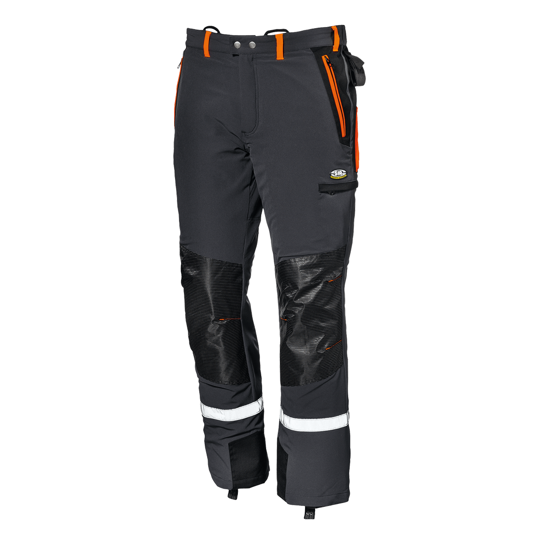 Trousers in Softshell, 195 g/m2, with padding for cut protection in 52% polyester and 48% polypropylene, lead grey with black and orange inserts in Cordura?. Zipper closure, snap button and hook button, D-ring on the second loop, side pockets and back pocket with zipper closure. Ruler pocket with right cutter holder, openable tool holder ring with Velcro on the left side, pen holder, elastic back waistband with rear-bib, rings for shoulder straps, left functional pocket with zipper. Rear slits on the legs with zipper for ventilation, knee wear-and-tear reinforcements, reflective band, dustproof elastic inside the ankle, reinforced kick tape.