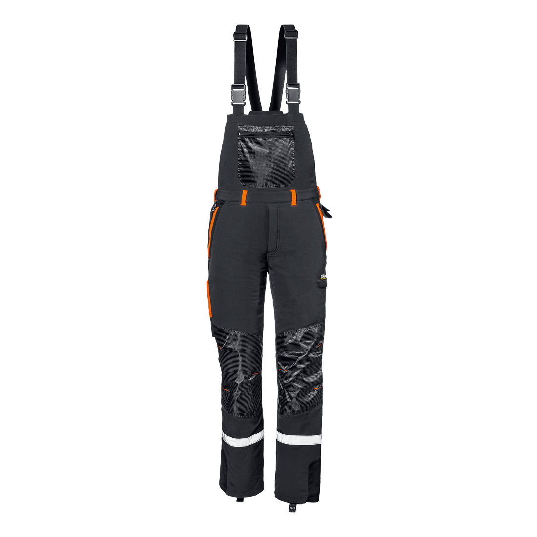 Bib-trousers in Softshell, 195 g/m2, with padding for cut protections in 52% polyester and 48% polypropylene, anthracite with black and orange inserts in Cordura?. Zipper closure, D-ring on the second loop, side pockets and back pocket with zipper closure, ruler pocket with right cutter holder, openable tool holder ring with Velcro on left side, pen holder, elastic back waistband. Elastic shoulder straps with quick-fastening buckle and adjustment loop, wide rear-bib, flap with pocket in polyester with zipper closure, left multifunctional pocket with zipper closure, rear slits on the legs with zipper for ventilation, knee wear-and-tear reinforcements, reflective band, dustproof elastic inside the ankle, reinforced kick tape.