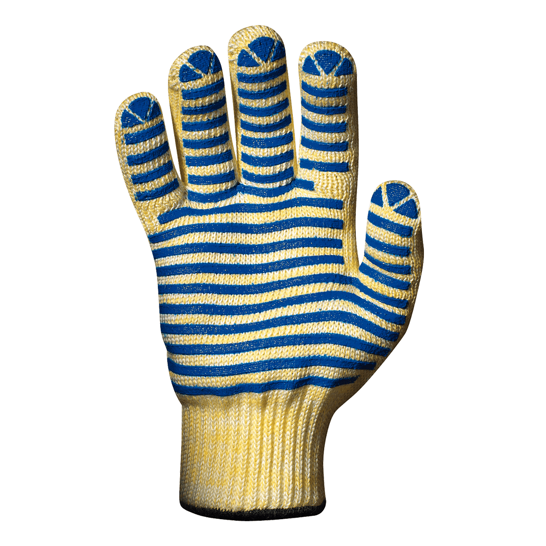Glove made of Nomex and Kevlar? knit fabric with silicon stripes on palm. Lining: highly insulating cotton knit fabric. Cuff: elastic knit fabric.
