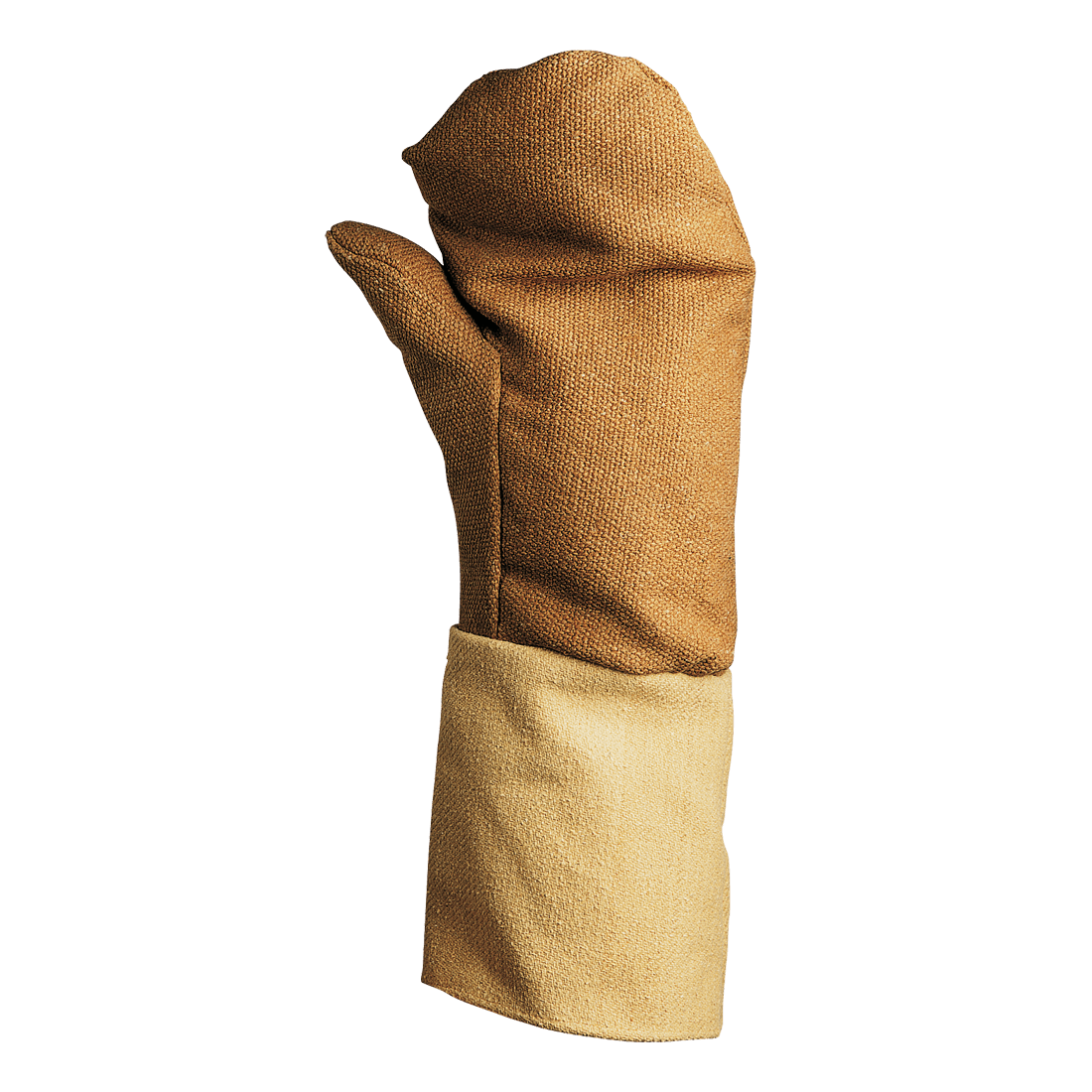 Mitten glove made of aramid fibre with padding in glass/wool fibre. Lining: fire resistant cotton. Cuff: 30 cm heat resistant cotton.