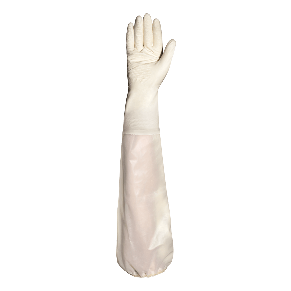 Disposable gloves in 0,2 mm nitrile. Inner: not flock-lined. Length: 65 cm. Finish: roughened finish. Box: 1 Pair.