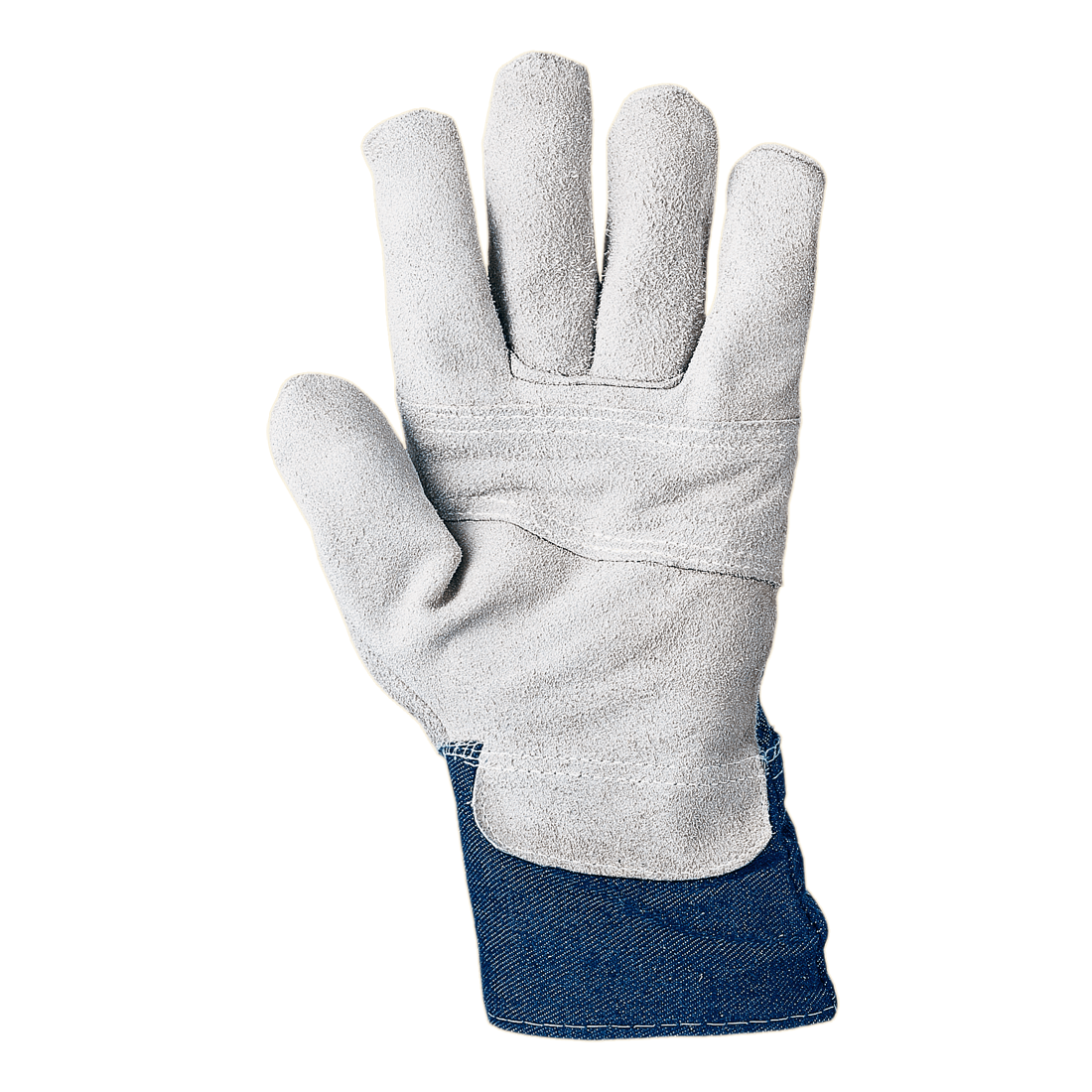 Glove made of 2nd choice split leather, back in denim cloth. Cuff: stiff denim cloth.