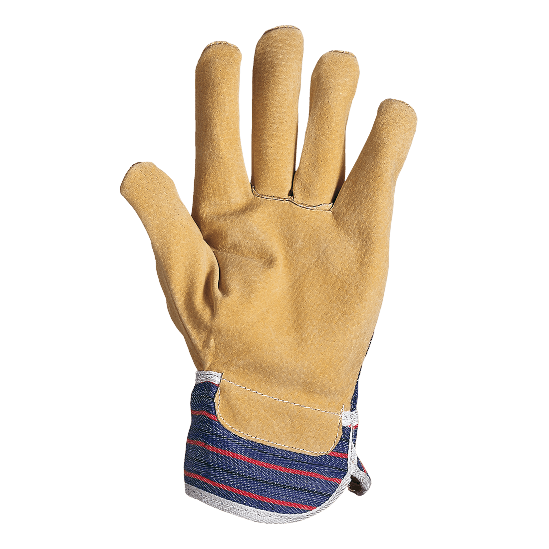 Glove made of top quality split leather. Back: cotton cloth. Cuff: cotton cloth.