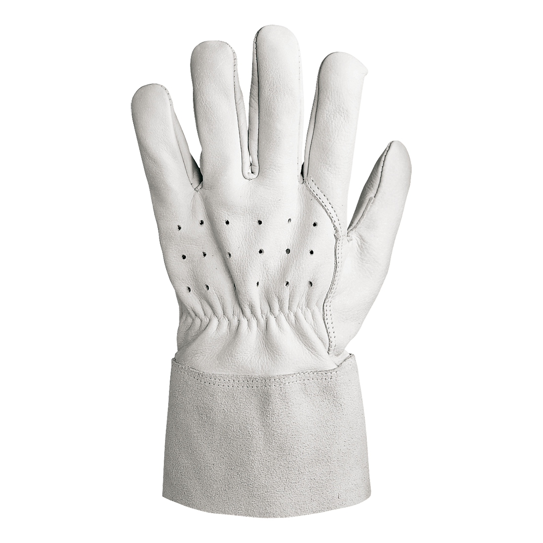 Glove made of grain cowhide. Perforated grain back. Cuff: 7 cm split leather cuff with wrist protection.