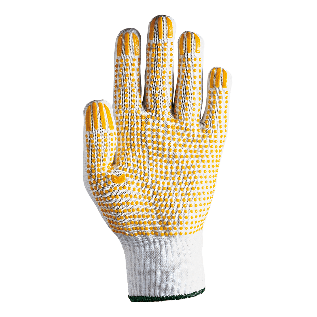 Glove made of elastic nylon thread with PVC dotted palm. Cuff: elastic knit.