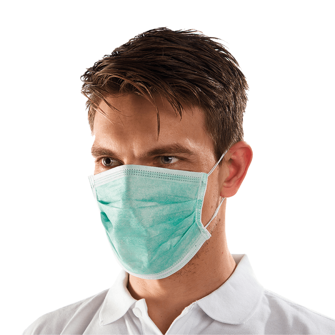 Surgery face mask, not sterile, made of a three-layer fabric resistant to aerial antiparticles, especially indicated for blood and saliva sprays. Pack of 50 pieces.