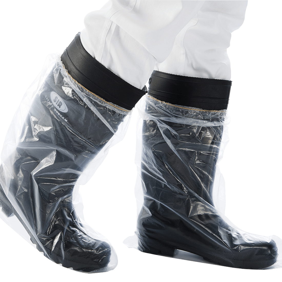 Shoe covers in polyethylene, thickness 0.06 mm, reinforced with dotted sole and fixed with elastic at calf height, 48x40 cm. Pack of 100 pieces.