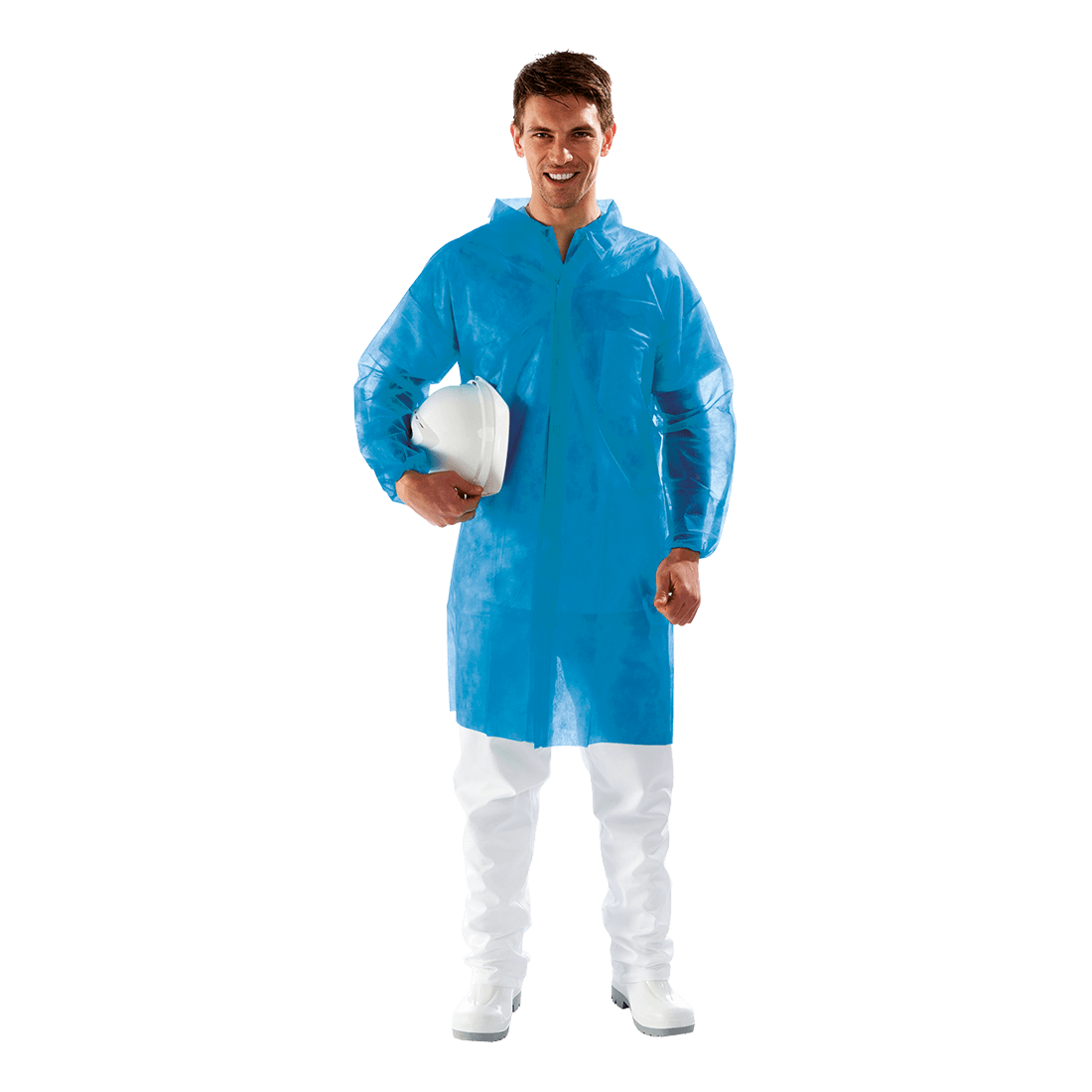 Polifilm coat in 100% polypropylene, weight 30 g/m2, not waterproof, breathable. It features two inner pockets and Velcro closure. Pack of 50 pieces.