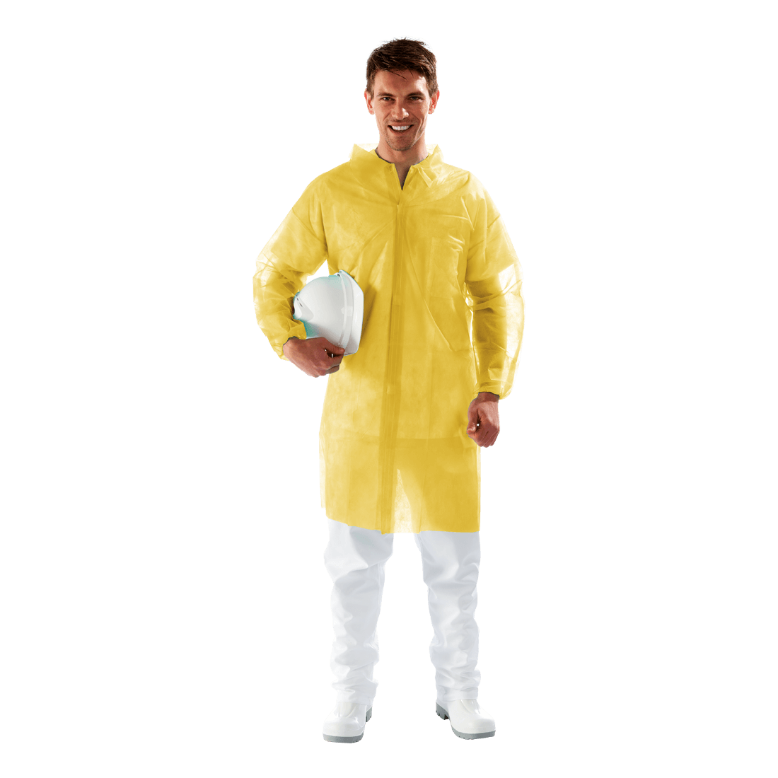 Polifilm coat in 100% polypropylene, weight 30 g/m2, not waterproof, breathable. It features two inner pockets and Velcro closure. Pack of 50 pieces.