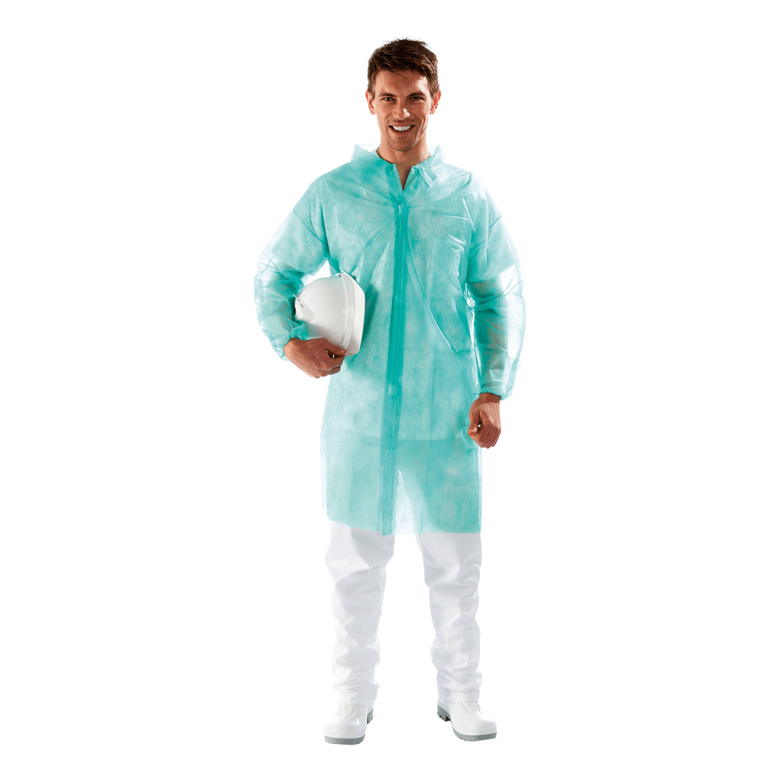 Polifilm coat in 100% polypropylene, weight 30 g/m2, not waterproof, breathable. It features two inner pockets and Velcro closure. Pack of 50 pieces.