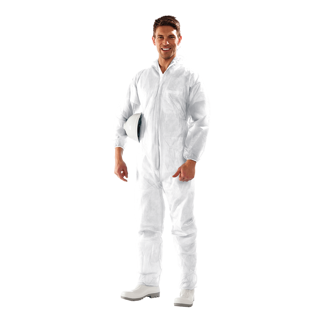 Coverall in 100% polypropylene, weight 40 g/m2. It features a concealed zipper closure with hood, elastic around the wrists and ankles. Pack of 50 pieces.