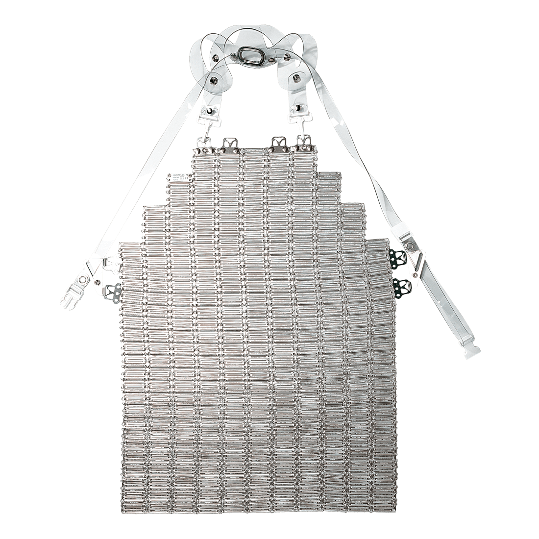 Apron in ultra-light aluminium plates linked with stainless steel rings, reversible. 55x70 cm. Withstands knife blows and its weight of 900 g is evenly distributed on the adjustable harness.