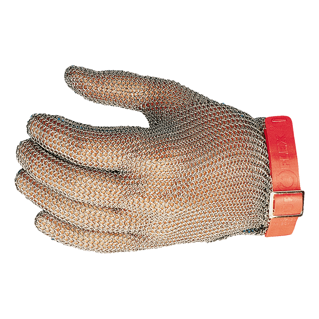 Butcher's glove in stainless steel chainmail with 0.6 mm thick rings, ambidextrous, with plastic adjustable buckle.