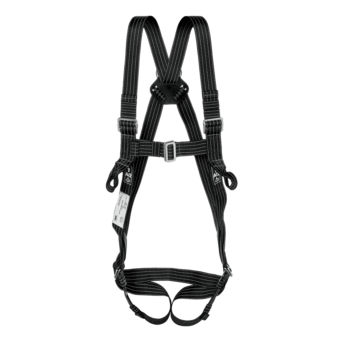 Harness certified for use up to 136 kg. Attachments: 2 fabric attachments on the chest, 1 aluminium D-ring on the rear part. Adaptability: adjustable chest and leg belts. Advantages: straps in antistatic polyester that prevent any kind of static electricity and allows the user to work safely in high risk environments; buckles in stainless steel.