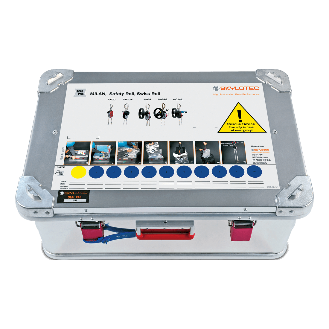Controlled atmosphere sealed metal box for storage of the MILAN 2.0 rescue device. The moisture indicator allows the operator to quickly check the equipment. Available in four measurements. Guaranteed storage time: 10 years.