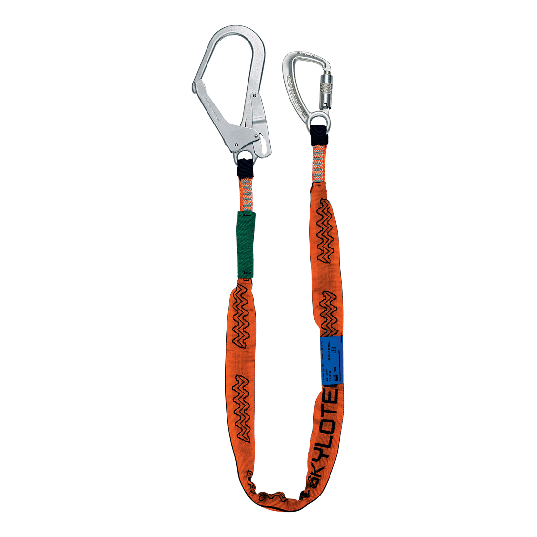 Fixed fall arrest device with 0.95 m limited length shock absorber. The material coating contains a rescue loop to which you can hook a rescue device with lifting function. Impact force: reduces fall arrest force to less than 6 kN. Lanyard length: 1.5 m. Lanyard: polyethylene.