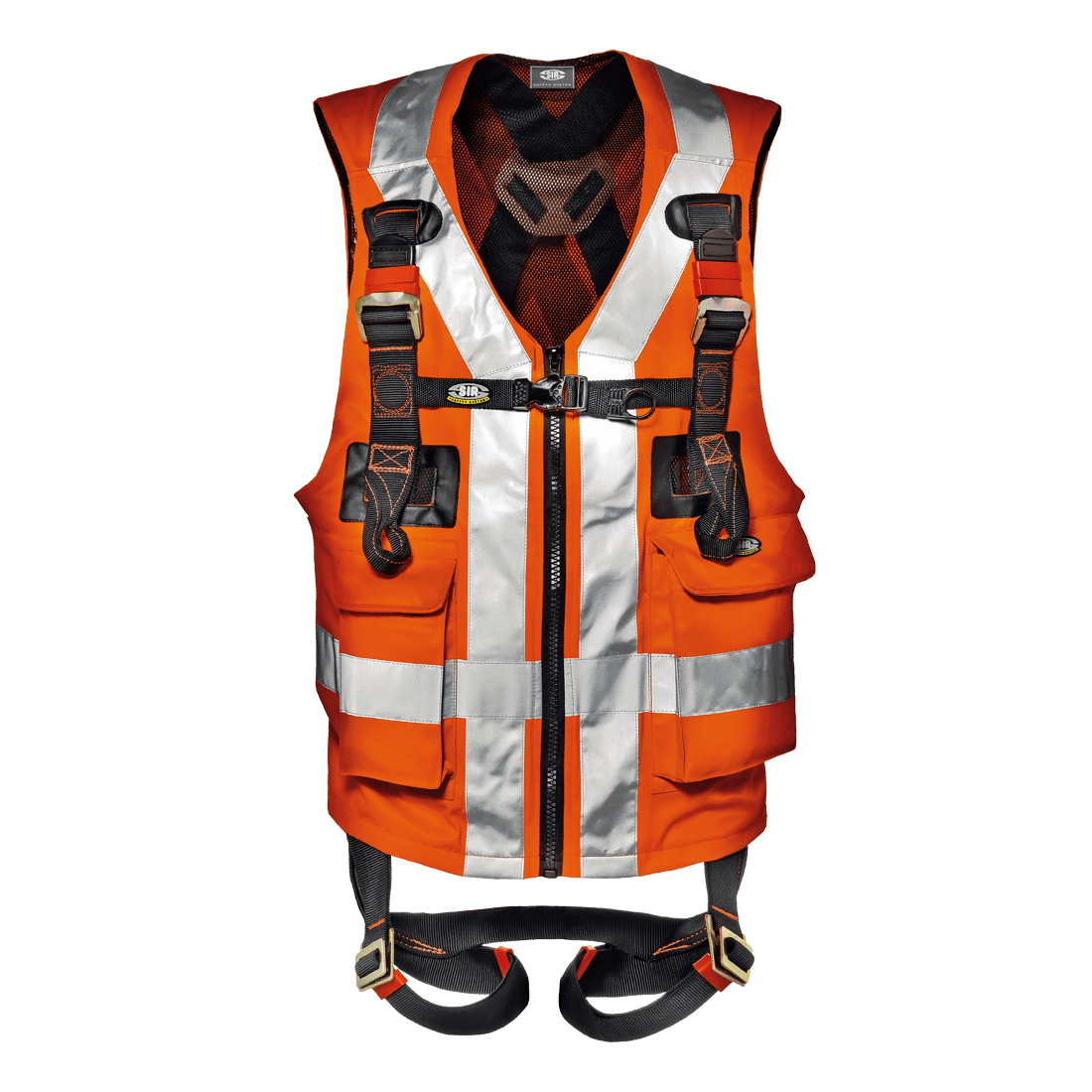 Two-point fall arrest harness, with permanently integrated high visibility orange vest. Equipped with one dorsal “D” attachment and sternal attachment consisting of two textile buckles for the fall arrest system. Front closure with quick-attach buckle, vest closed with zipper, single reflective band around waist and double one on collar, chest and back, two tridimensional side pockets with flaps. Weight: 1,70 kg.