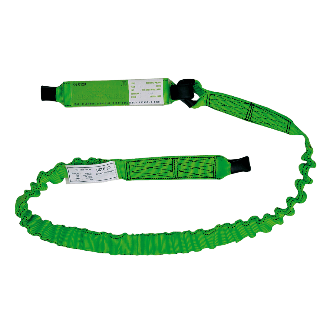 Expandable elastic webbing lanyard, 44 mm, with energy absorber. Max length: 2 m. Min length: 1.4 m.