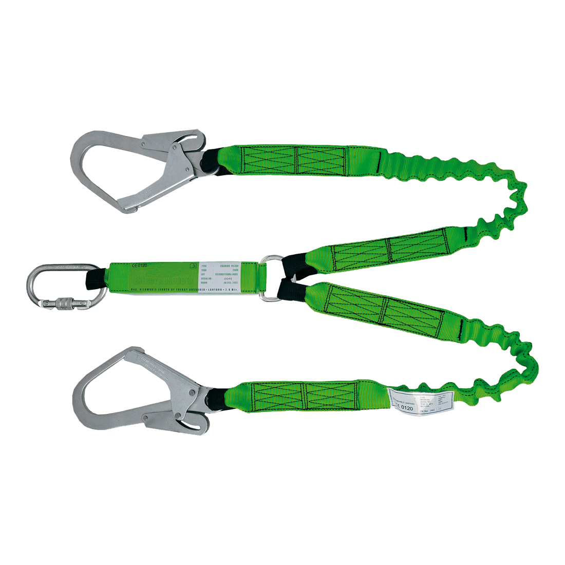 Expandable elastic webbing lanyard, 44 mm, with energy absorber. Max length: 2 m. Min length: 1.4 m. Fitted with 1 Standard and 2 Montblanc karabiners.