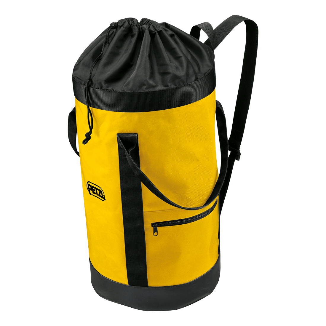 Fabric pack with two large, comfortable carrying handles and an adjustable webbing for carrying bandolier style. Bottom is lined for longer wear.
