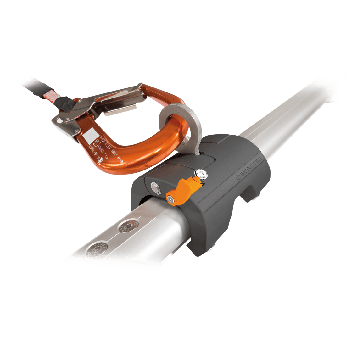 The Skyrail System is made of seawater resistant aluminium alloy. Designed for floor, wall and ceiling installation. Various radius turn modules for horizontal direction changes. The ball bearing mounted runner is subject to less wear and provides excellent running properties even in rope access applications. The runner may be inserted or removed anywhere in the system. Since a variety of supports is available, numerous installation requirements are met. Max. number of operators: 3.