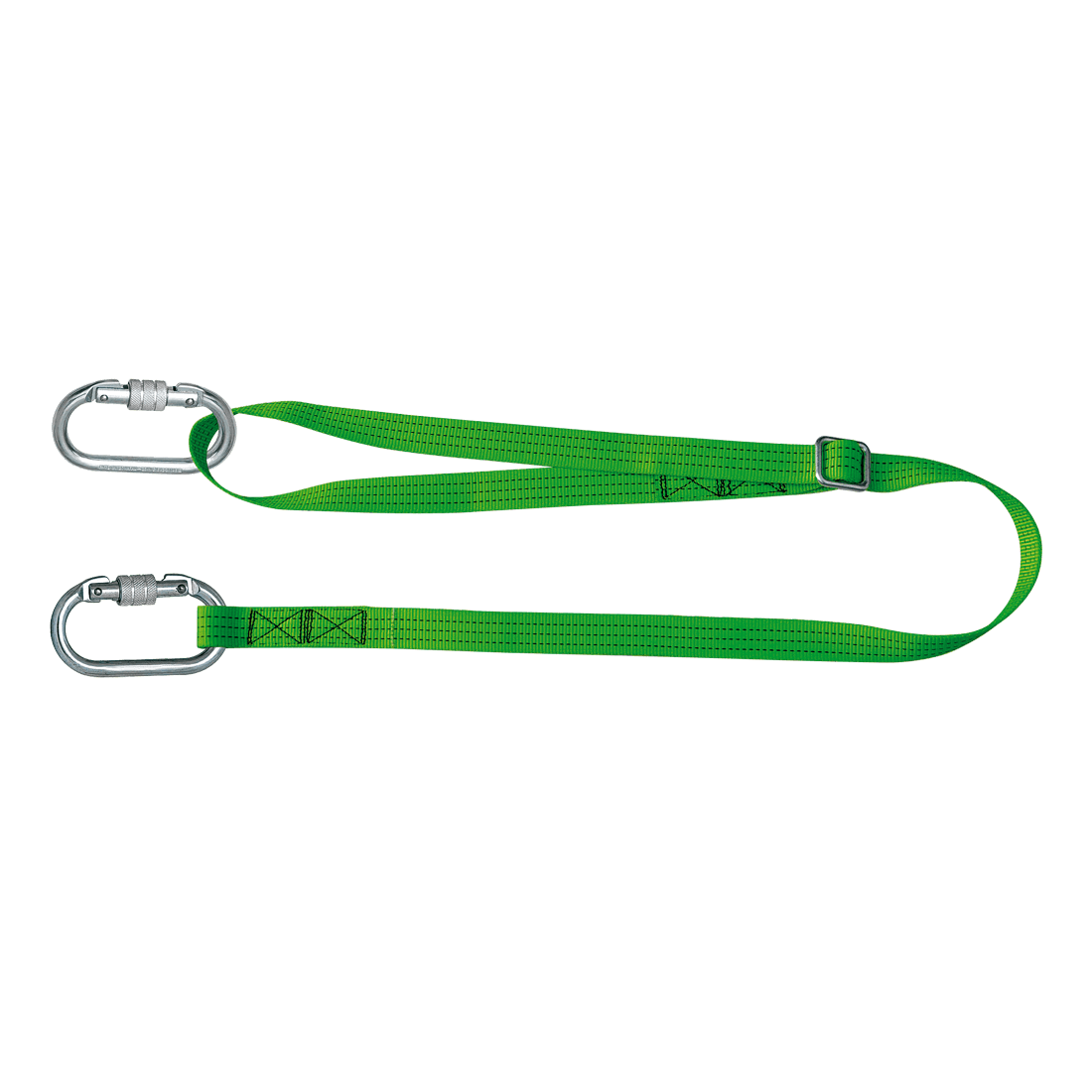 From 1 to 2 m adjustable polyester webbing; 33 mm wide, with two Standard karabiners at the extremities.