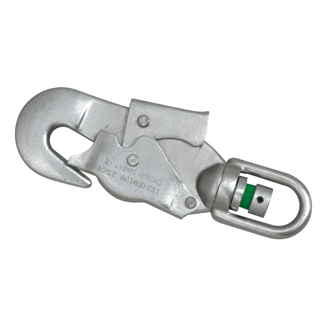 Steel snap hook, 11.5 mm opening; the indicator band is green when the connector has not suffered a fall. In the event of a fall, the indicator colour changes to red and thereby serving as a warning signal before subsequent use. Minimum breaking strength: 23 kN.