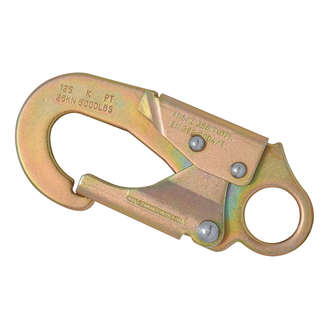 Steel snap hook, 22.5 mm opening; double safety lock. Special design prevents accidental press over the lock, thereby making this double locking snap hook even safer. Minimum breaking strength: 23 kN.
