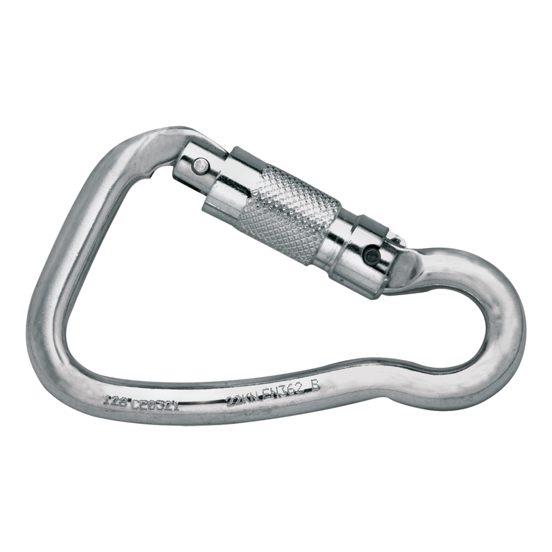 Aluminium karabiner, 22.5 mm gate opening and triple action-locking. Minimum breaking strength: 23 kN.