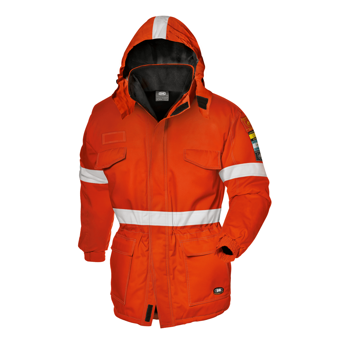 Padded Jacket, outer layer in 87% cotton, 12% nylon and 1% carbon fibre, 255 g/m2 and padding in 100% aramid, 150 g/m2. High collar, concealed metal zipper closure with flap and Velcro, straight sleeves, detachable hood with metal zipper; elastic cuffs, two chest pockets and two lower wide pockets all with flaps and Velcro, drawstring waistband. Reflective band on the hood, chest and sleeves.