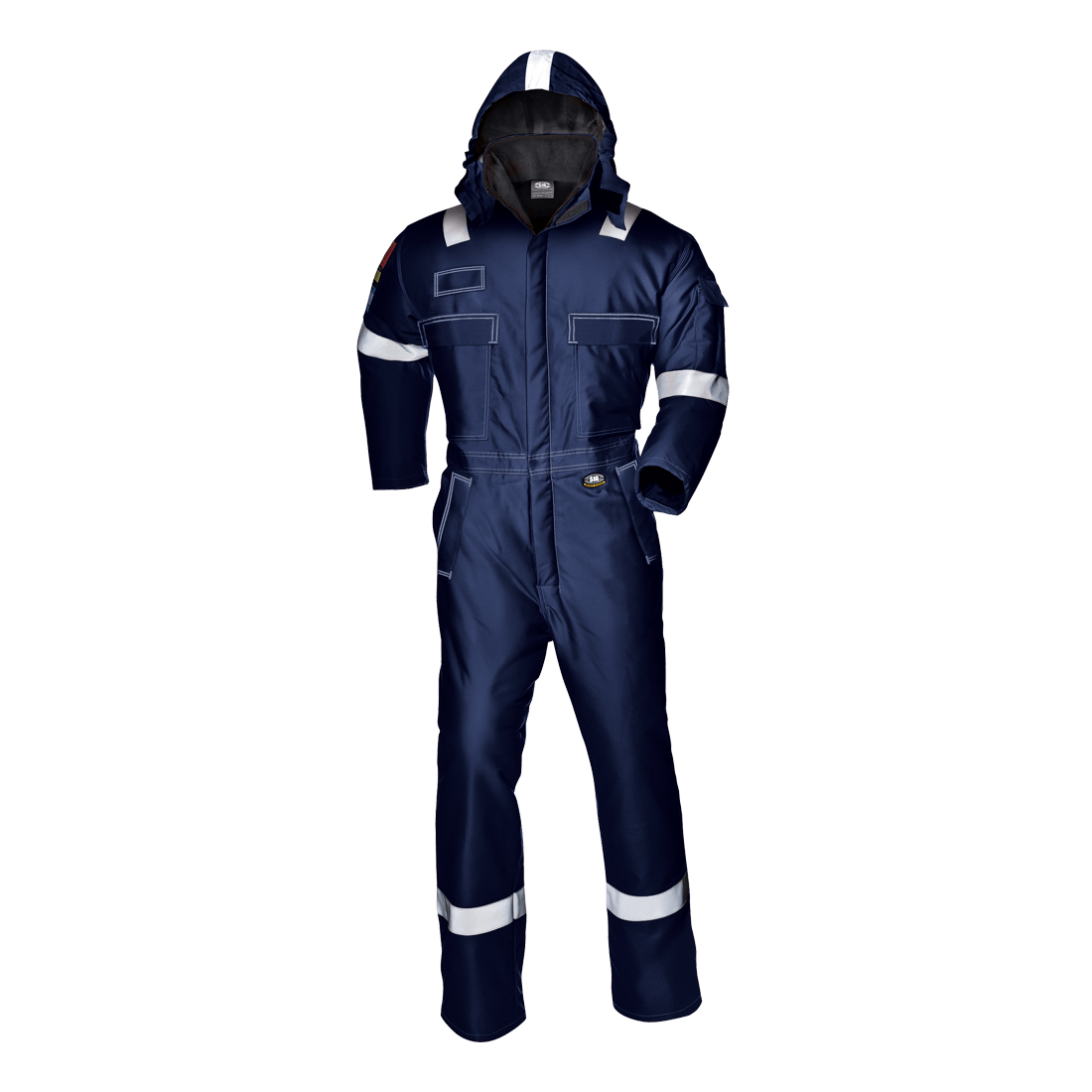 Padded coverall, outer layer in 87% cotton, 12% nylon and 1% carbon fibre, 255 g/m2 and padding in 100% aramid, 150 g/m2. With high collar and straight sleeves, concealed zipper closure with Velcro, chest pockets with zipper and flap, ruler pocket with flap and Velcro; detachable padded hood, elastic waistband, gas detector holder, reflective bands on the hood, shoulders, legs and arms.