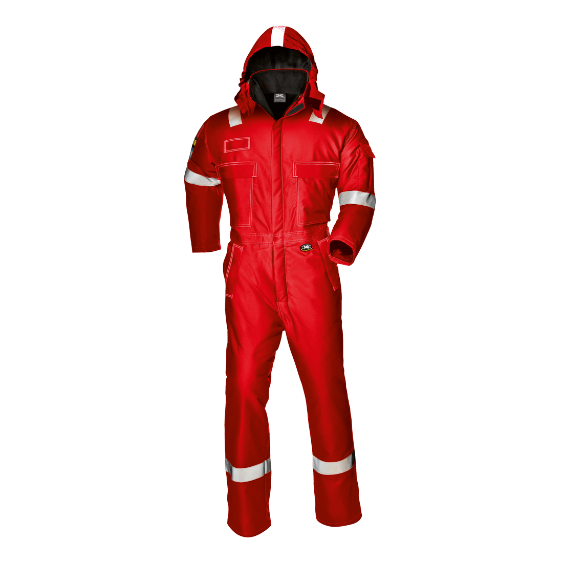 Padded coverall, outer layer in 87% cotton, 12% nylon and 1% carbon fibre, 255 g/m2 and padding in 100% aramid, 150 g/m2. With high collar and straight sleeves, concealed zipper closure with Velcro, chest pockets with zipper and flap, ruler pocket with flap and Velcro; detachable padded hood, elastic waistband, gas detector holder, reflective bands on the hood, shoulders, legs and arms.