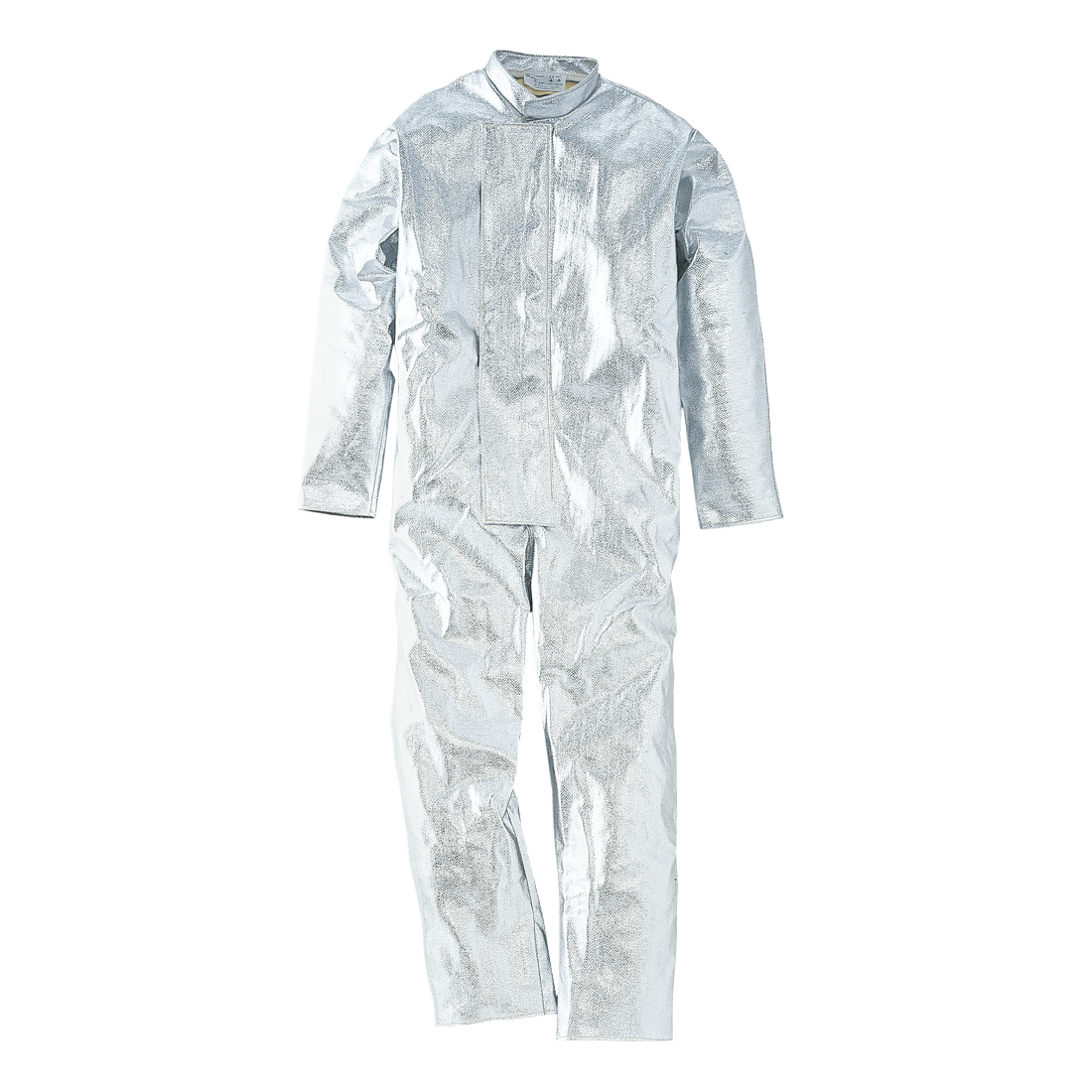 Coverall with high mechanical and thermal resistance, made of aluminized para-aramidic fibre; front concealed buttoned closure with Velcro flap, Chinese collar and dedicated oxygen tank holder’s space opening on the back.