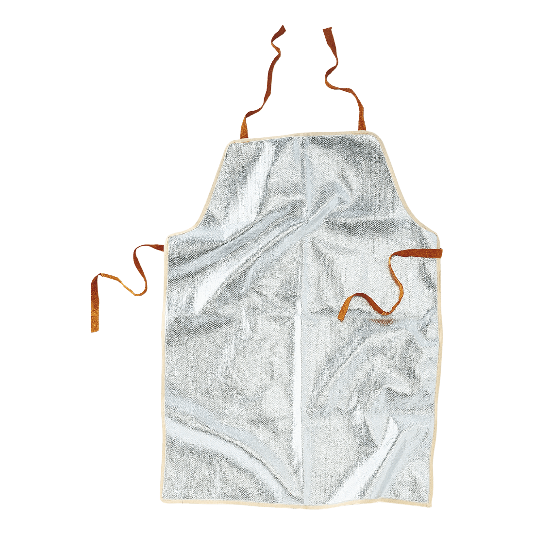 Apron in aluminized para-aramidic fibre, thickness 1.1 mm, high mechanical and heat resistance. Neck and sides closure with split leather strings. 70x100 cm.