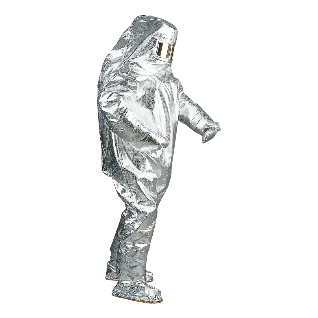 Full Set consisting of coverall, hood, gloves and shoe covers in Para-aramidic aluminized fibre, lined and insulated. Hood incorporated into the coverall, concealed rear zipper closure with double flap sealed by snap buttons, hood with panoramic visor in laminated, tempered safety glass, curved, gold-dyed and replaceable, it features mittens gloves and anti-slip cuffs.