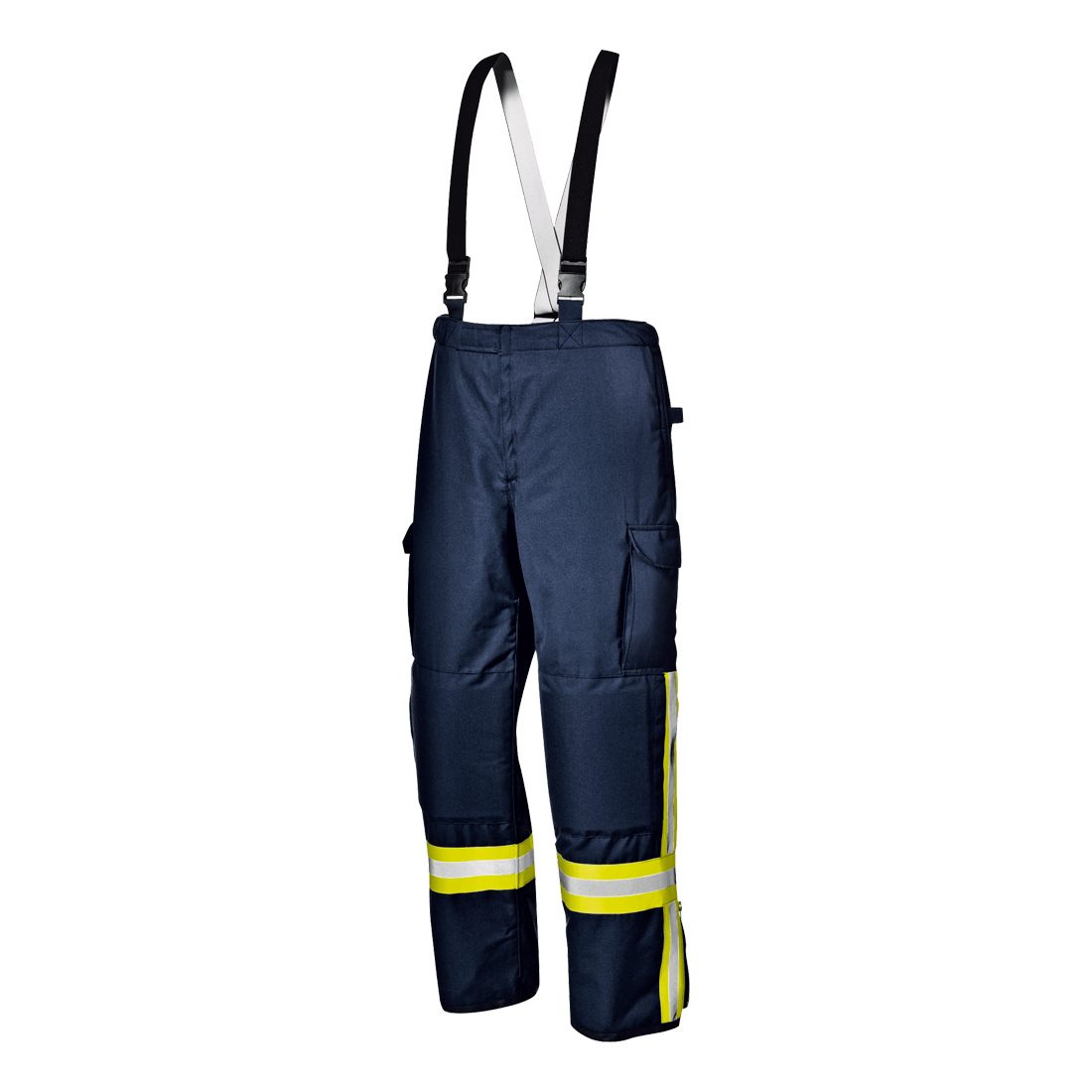 Overtrousers in 4-layer aramid fabric. It features high bib, adjustable elastic shoulder straps, elastic waistband, two side welt pockets with Velcro, two functional pockets with flaps and Velcro on the legs, removable knee protection, ankle zips for an easy use with boots, fluorescent and reflective material inserts.