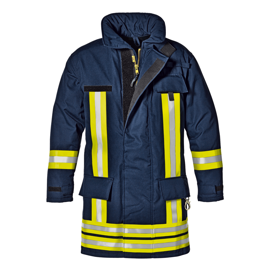 Jacket in 4-layer aramid fabric. Concealed anti-panic safety zipper closure with Velcro, neck closure with Velcro, inner pocket with Velcro, side pockets with flaps and Velcro, chest radio pocket with flap and Velcro, side pocket with tool holder karabiner, adjustable width sleeves and knitted internal cuffs with sleeve-stop string. Reflective inserts on the chest, on the sleeves and on the bottom of the jacket.