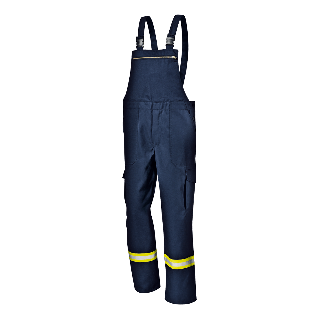 Bib-trouser in 50% Nomex and 50% Viscose 210 g/m2. Features adjustable elastic shoulder straps, with quick locking , metal zipper fly, adjustable waistband with buttons, chest pocket with zipper closure, side welt pockets, functional pockets on the legs closed with flap and Velcro, rear pocket closed with flap and button, inserts in fluorescent and reflective material inserts.