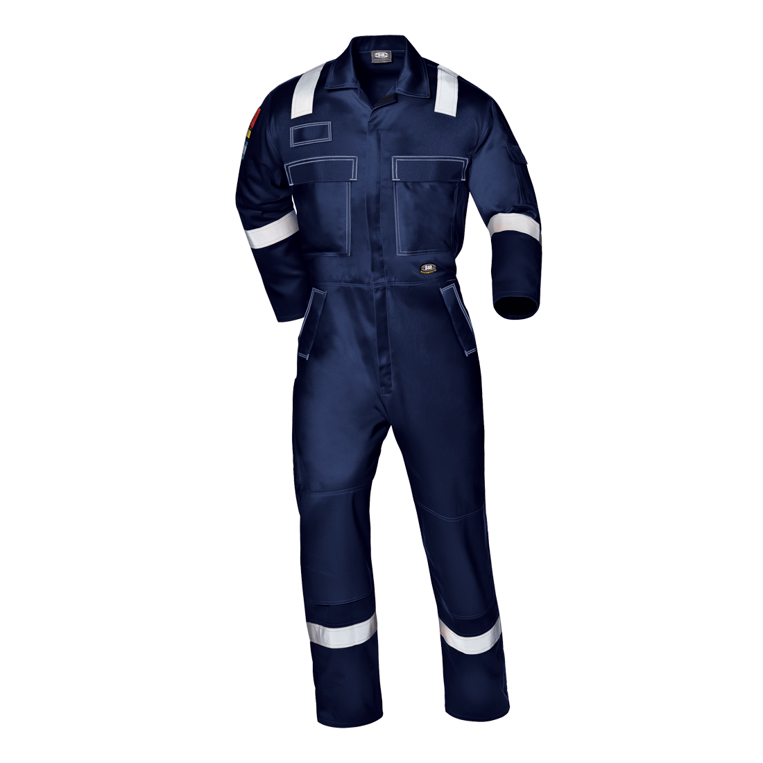 連體工作服,襯衣領,外層面料為87%棉,12%尼龍和1%碳纖維,克重:255g/m2。中央雙向帶魔術貼拉鏈,翻蓋魔術貼胸袋,有口袋上方有可掛氣體檢測器的掛環,左袖、褲側有翻蓋魔術貼口袋,隱藏式彈性腰帶。兩個翻蓋魔術貼后口袋和膝蓋處魔術貼封口口袋,魔術貼翻蓋尺袋,肩膀、衣袖和褲腳有反光條。- 所有Carboflame 系列都是阻燃抗靜電,適合保護工作人員免受意外輕微火焰接觸,熔融金屬飛濺和短時間的意外電接觸傷害。- - 反光條可提供夜間工作安全。配合連體服可使用我們相對應的內衣工作服,Carboflame 內衣型號:35285和Carboflame 內褲型號:35286,符合IEC 61482-2中A.2的標準要求,關于配合電弧防護服使用,應當穿著不被電弧熱溶解的材質的內衣。該產品的設計和制造符合89/686/EEC的基本健康和安全要求,它被列為PPE等級III。