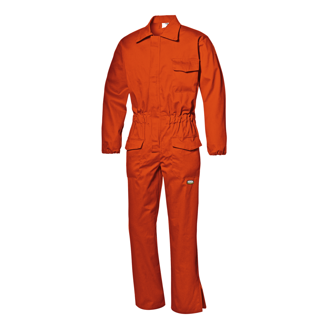Coverall in 100% Flame Retardant cotton fabric, weight 315 g/m2. Concealed metal zipper closure with Velcro, elastic cuffs, side pockets and chest pocket with flaps and Velcro, elastic waistband, ankle zipper closures.